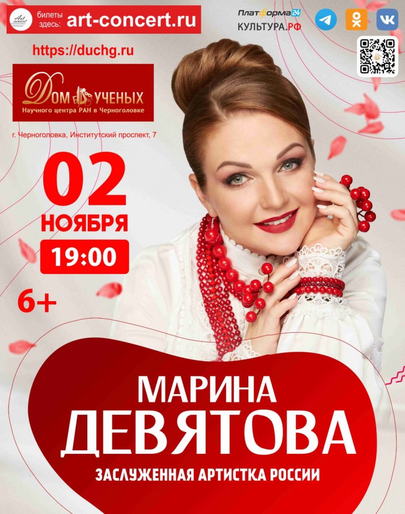 2 ноября в 19:00 на сцене Дома ученых НЦЧ РАН состоится выступление Заслуженной артистки Российской Федерации Марины Девятовой.