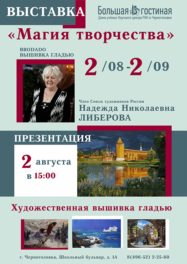Со 2 августа по 2 сентября 2025 в Большой гостиной Дома ученых НЦЧ РАН пройдет выставка картин, вышитых гладью Члена Союза художников России Надежды Николаевны Либеровой.