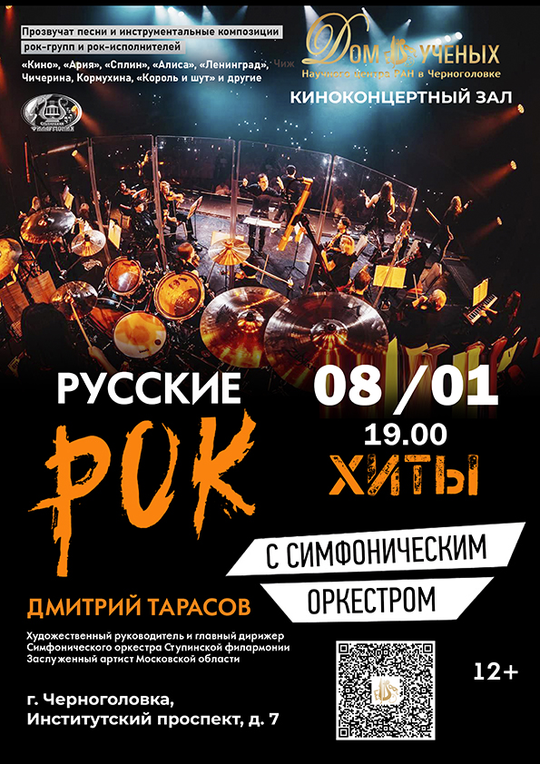 8 января в 19.00 в киноконцертном зале Дома ученых НЦЧ РАН состоится концерт «Русские рок — хиты с симфоническим оркестром. Продолжение». Солисты и СИМФОНИЧЕСКИЙ ОРКЕСТР СТУПИНСКОЙ ФИЛАРМОНИИ, под руководством Заслуженного артиста Московской области Дмитрия Тарасова. В этот вечер со сцены прозвучат легендарные композиции, знакомые каждому, выросшему на русском роке. «Кино», «Ария», «Би-2», «Король и Шут», «Звери», «Мумий тролль», «Леприконсы» – песни этих и многих других культовых групп обретут новое звучание в сопровождении симфонического оркестра. Смелое сочетание роковой энергии и классической мощи никого не оставит равнодушным.