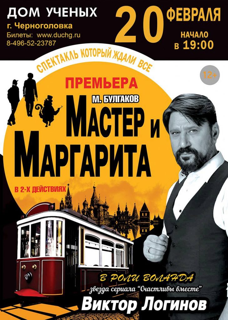 Вы увидите мистическую драму о любви и предательстве в исполнении ведущих артистов театра, в роли Воланда  — актер театра и кино Виктор Логинов.