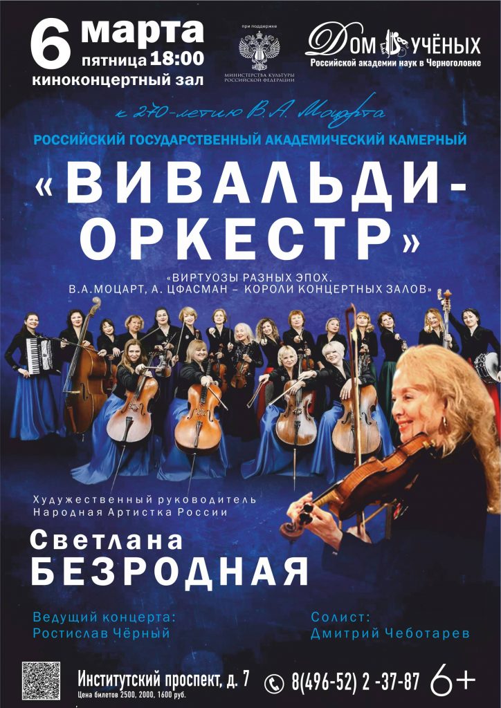 6 марта в 18.00 на сцене киноконцертного зала с премьерой программы «Виртуозы разных эпох. В.А. Моцарт, А. Цфасман – короли концертных залов» выступит Российский государственный академический камерный «Вивальди-оркестр» под руководством Народной Артистки России Светланы Безродной.