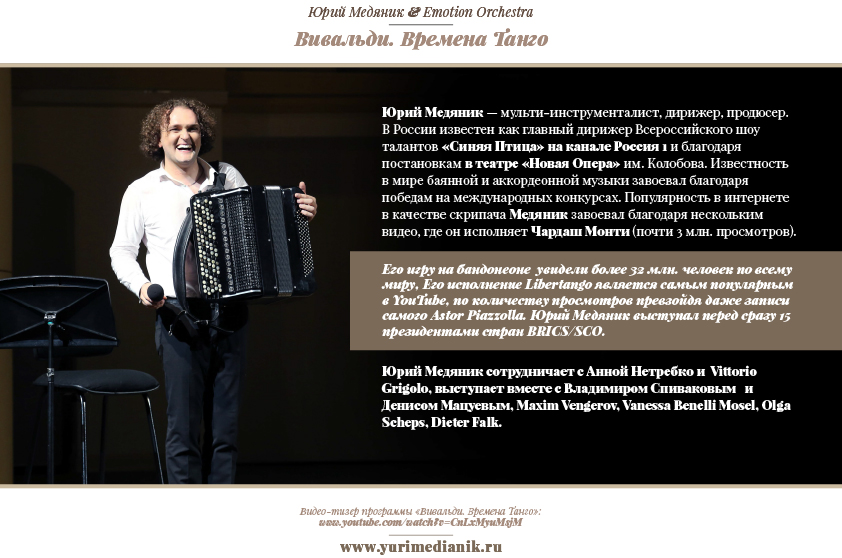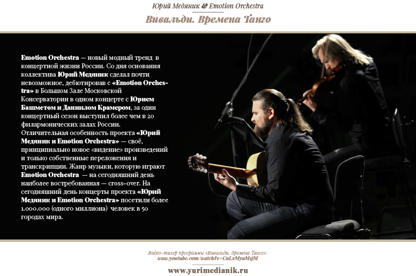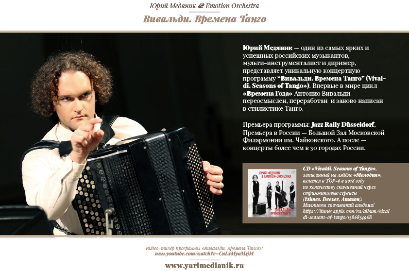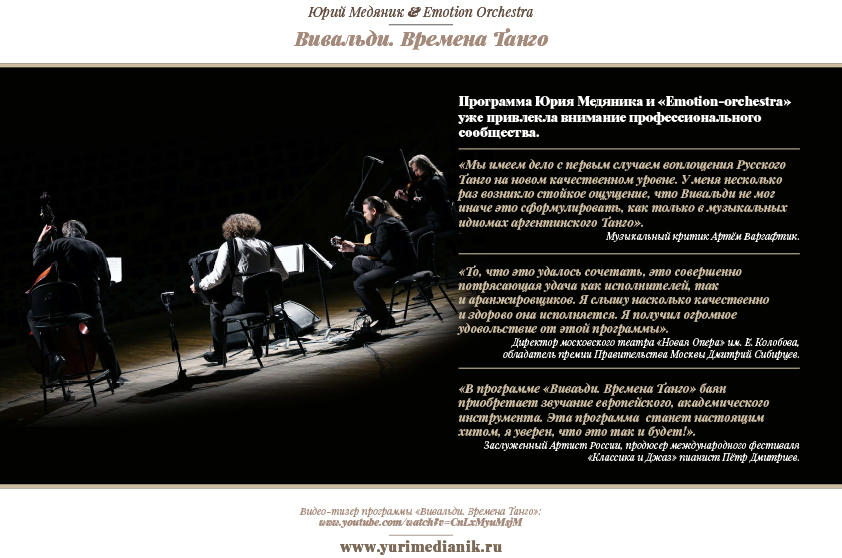 В программе выступления коллектива 23 марта в Доме ученых РАН в Черноголовке «Вивальди. Времена танго» — знаменитый цикл концертов для скрипки Антонио Вивальди «Времена года», который прозвучит в стилистике танго.