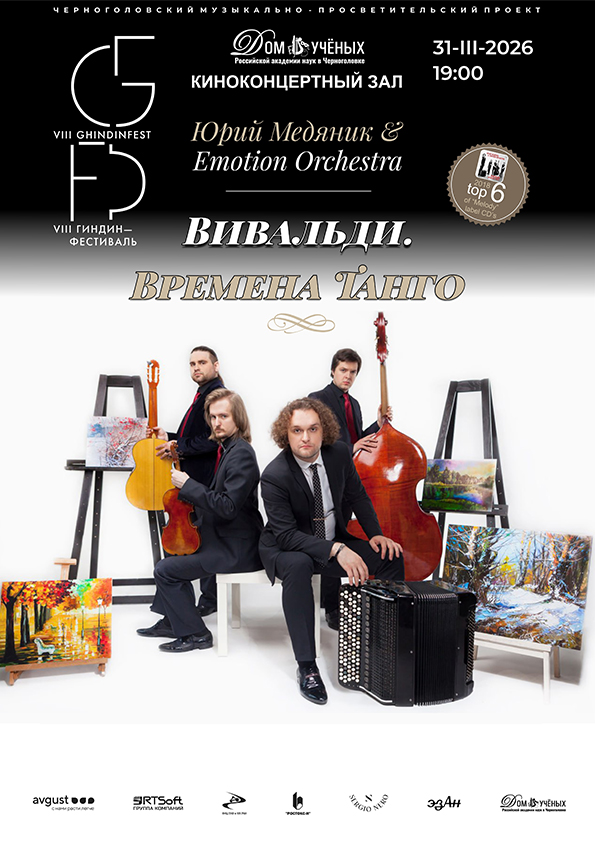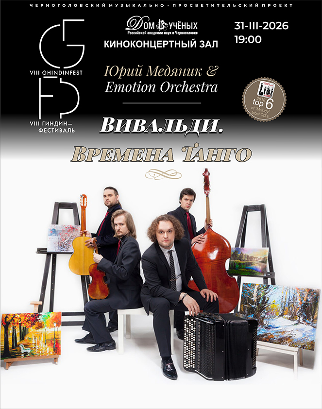 31 марта 2026 г. в киноконцертном зале Дома ученых РАН в Черноголовке в рамках VIII Международного музыкально-просветительского проекта «Гиндин-фестиваль» состоится концерт мультиинструменталиста Юрия Медяника и Emotion Orchestra.