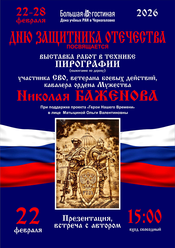 С 22 по 28 февраля 2026 г. в Большой гостиной Дома ученых РАН в Черноголовке пройдет персональная выставка работ Ветерана боевых действий Специальной военной операции Николая Баженова в технике пирографии.