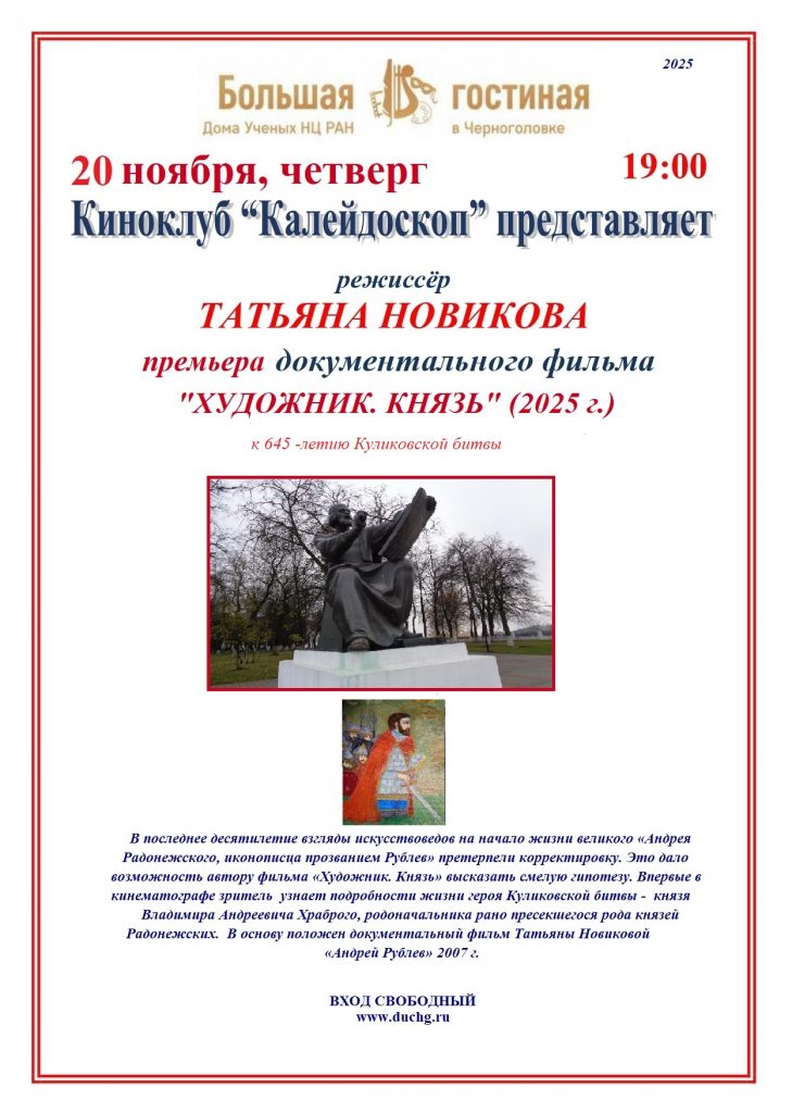 20 ноября в 19.00 в Большой гостиной состоится Премьера документального фильма Татьяны Новиковой «Художник. Князь» (2025 г.).