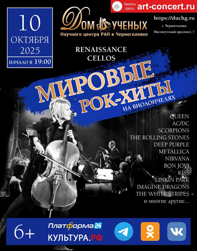 В программе композиции «Metallica», «AC/DC», «Queen», «The Rolling Stones», «Kiss»; «Nirvana»,«Deep Purple», «Scorpions», Bon Jovi, «The White Stripes», «Nightwish», «Imagine Dragons, «Linkin Park» — всё это и не только в авторских аранжировках и неповторимом звучании виолончелей! Неподражаемое мастерство, оригинальное исполнение, яркие эмоции и только хиты на концерте «Renaissance Cellos»!
