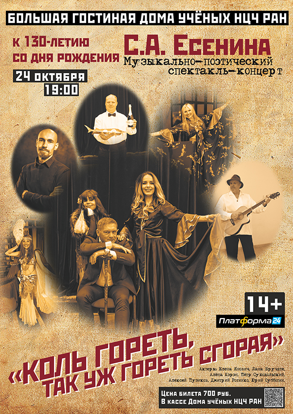 24 октября в 19.00 в Большой гостиной состоится музыкально-поэтический спектакль к 130-летию со дня рождения С.А. Есенина «Коль гореть, так уж гореть сгорая».
