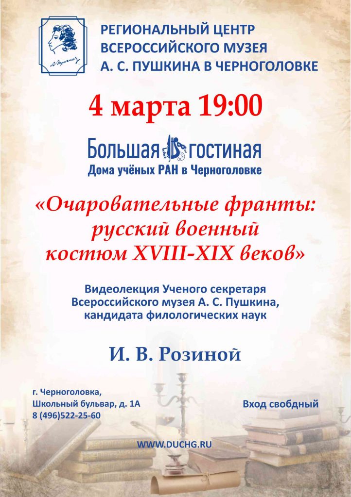 «Очаровательные франты: русский военный костюм XVIII-XIX веков» — видеолекция Ученого секретаря Всероссийского музея А. С. Пушкина, кандидата филологических наук И.В. Розиной
