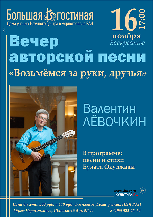 16 ноября в 17.00 в Большой гостиной состоится Вечер  бардовской песни Валентина Левочкина, посвященный творчеству Булата Окуджавы.