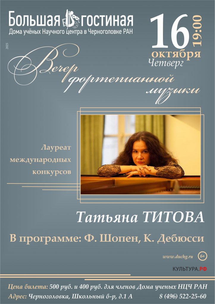 16 октября 2025г. в Большой гостиной Дома ученых состоится Вечер фортепианной музыки лауреата международных конкурсов Татьяны Титовой.