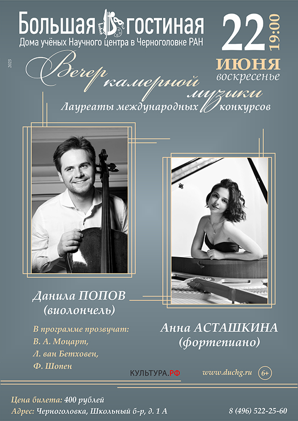 22 июня в 19:00 в Большой гостиной состоится вечер камерной музыки Лауреатов международных конкурсов Данилы Попова (виолончель) и Анны Асташкиной (фортепиано)/