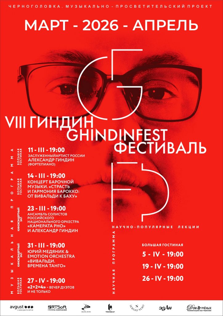 С 11 марта по 27 апреля 2026 года в Доме ученых РАН в Черноголовке пройдет VIII международный музыкально-просветительский проект «Гиндин-фестиваль», который объединит музыкантов и ученых.